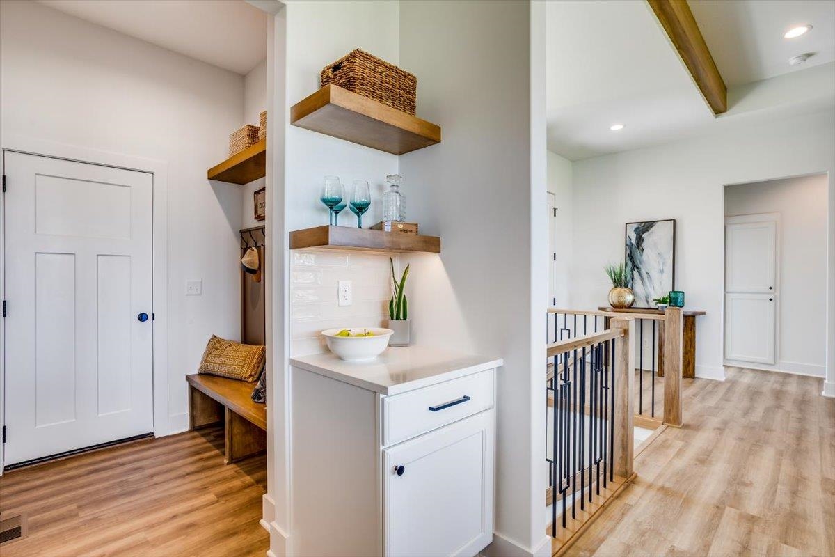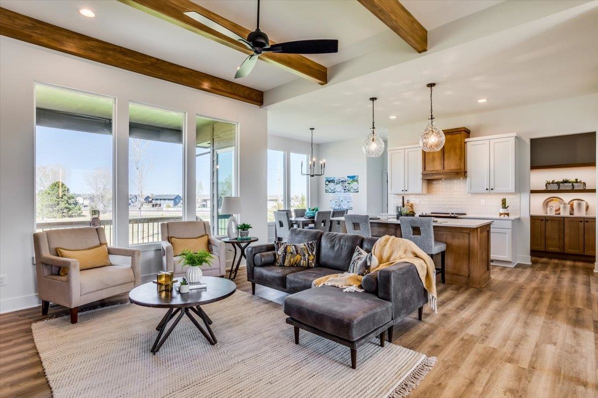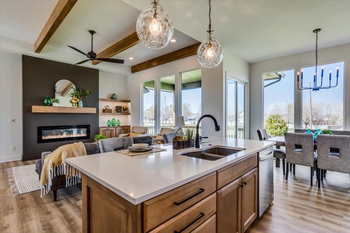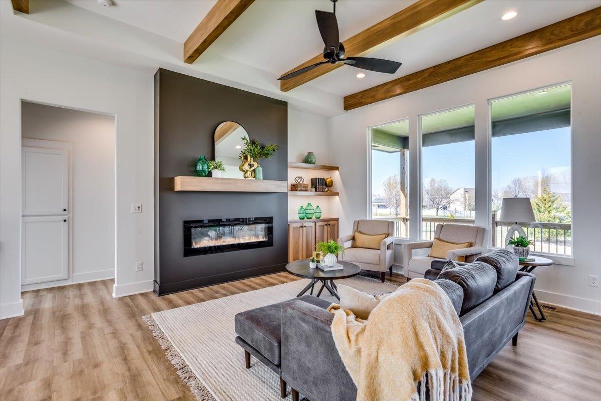 - Description: MODEL IS NOW FOR SALE! Welcome to The Oakley by M&M Construction in Henwick! This thoughtfully designed home features an inviting open-concept layout with an 11-foot ceiling in the living room, enhanced by wood beams for an extra touch. The accent-painted wall surrounding the electric fireplace creates a striking focal point, framed by cabinetry and floating shelves with integrated lighting. The kitchen boasts a custom range hood, a spacious walk-in pantry, and a an extra side space perfect for a coffee bar. The primary suite offers a retreat with a 10-foot beamed ceiling and a spa-like ensuite featuring a zero-entry tile shower with dual showerheads and valves. Designed for comfort and efficiency, the home includes an upgraded HVAC system. There is a convenient drop zone just inside the garage entry to the home. Outside to enjoy the 14-by-10 covered deck, perfect for relaxing or entertaining. The front exterior showcases additional brick detailing and striking black-framed windows for enhanced curb appeal. Quartz countertops throughout the home including the pantry. The finished basement expands the living space with a large family room, complete with a wet bar and island—ideal for gatherings. Two additional bedrooms and a full bath complete the lower level, making it a perfect space for guests or family. Information deemed reliable but not guaranteed and may change without notice. Specials and generals may not be entirely spread yet on this lot There is a $250 mailbox fee collected at closing.
