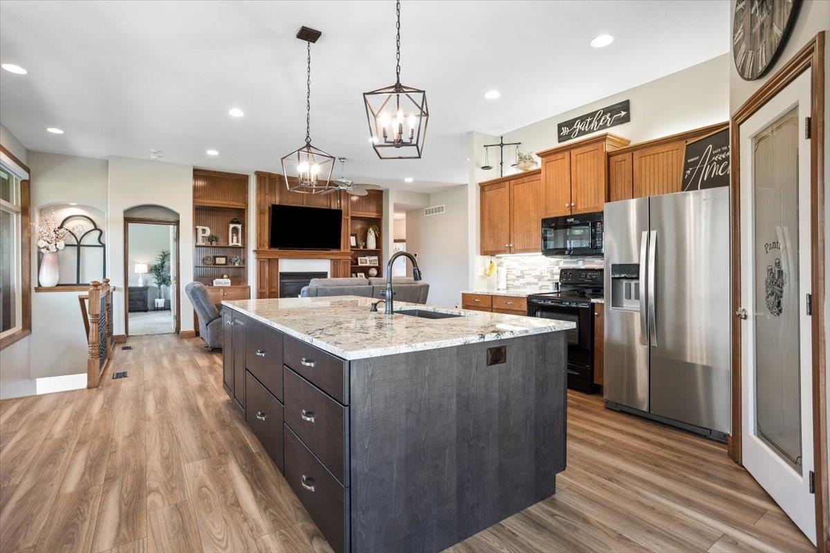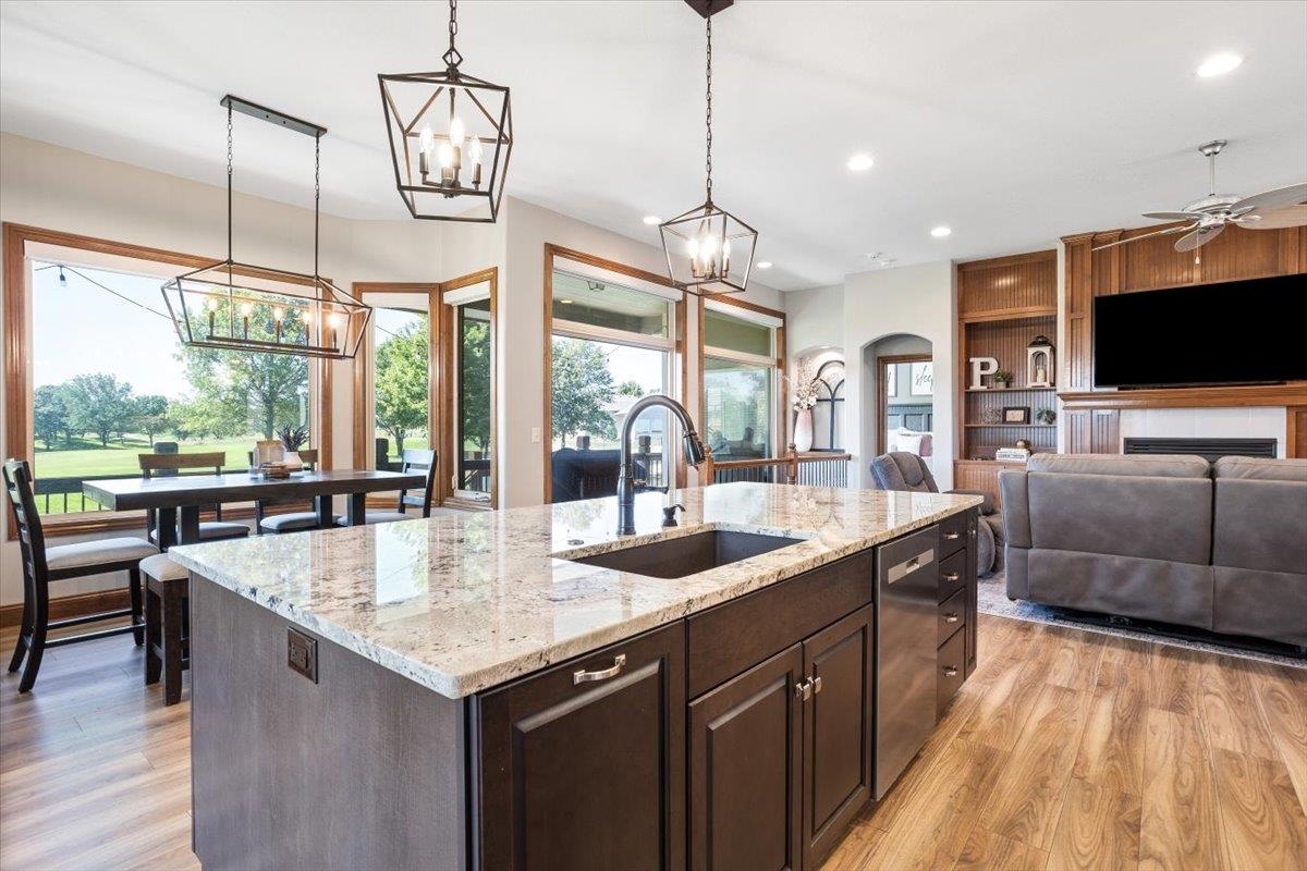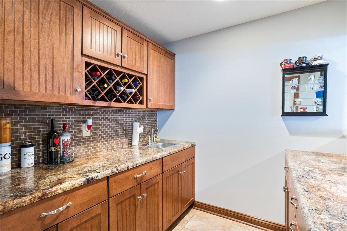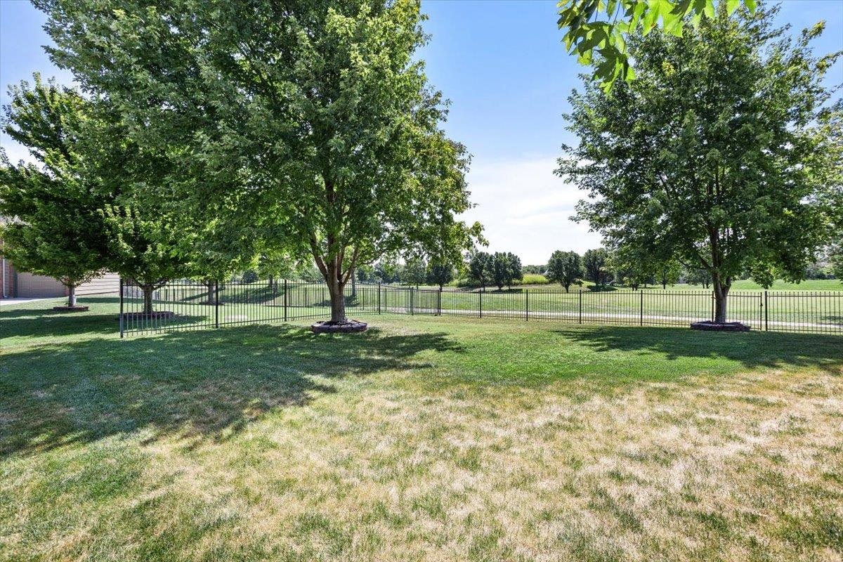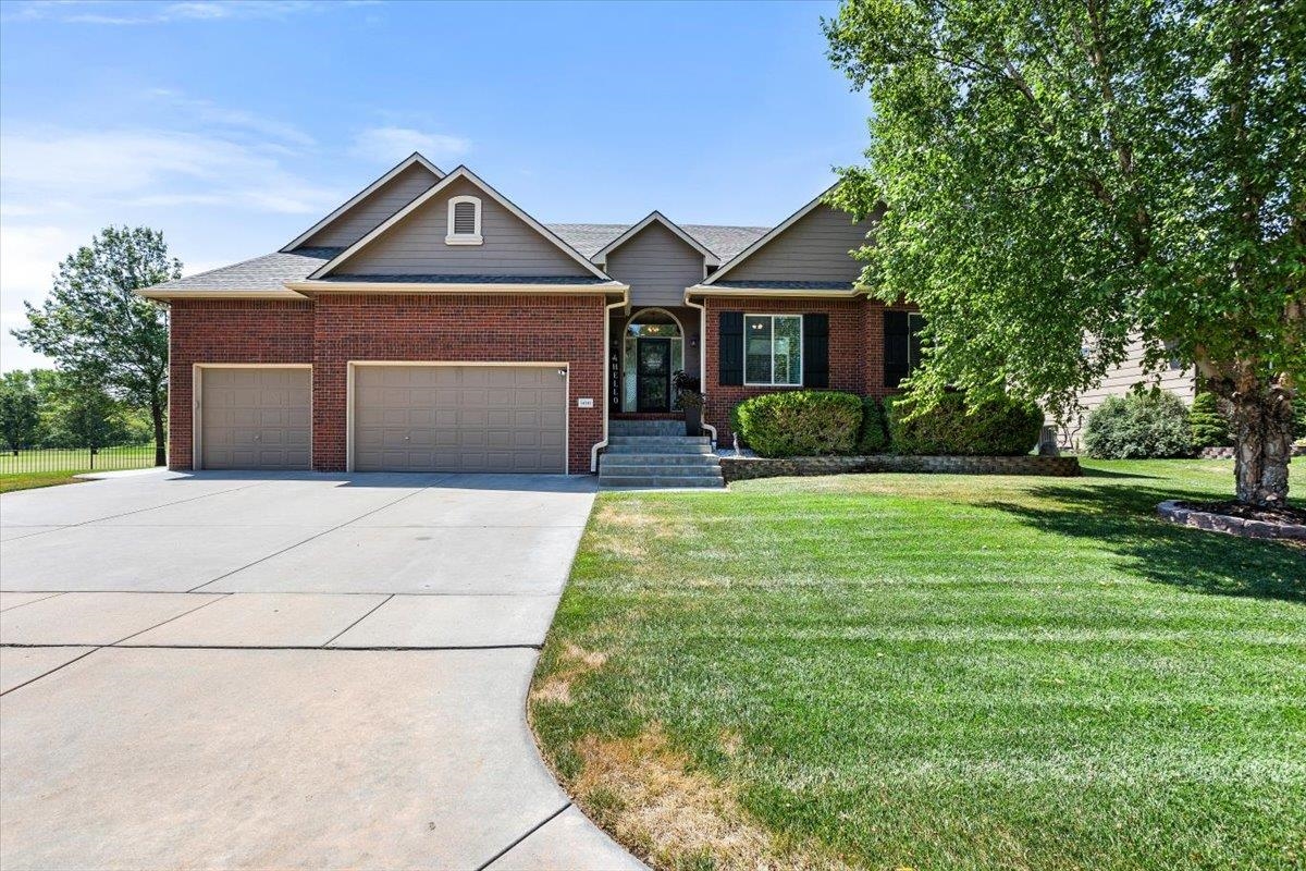- Description: Nestled among mature trees on the Auburn Hills serene golf course, this stunning 5-bedroom, 3-bath, 3-car garage home boasts an extra side yard lot all enclosed by an iron fence. Inside, the house has been meticulously updated with luxury vinyl flooring throughout the entry, living room, kitchen, dining room, laundry room, and office nook. Large tinted windows span the back of the house, offering breathtaking views, while auto Rolli brand blackout blinds in the kitchen and living room provide privacy and comfort. The spacious kitchen features a new granite topped large island with ample storage on both front and back, a refrigerator, and a dishwasher, both less than a year old, along with a range and microwave. The living room is anchored by a cozy fireplace surrounded by built-ins, with a TV above that stays! The recently renovated laundry room includes extra storage and a granite folding area, with a stacked washer and dryer that are also less than a year old and stay with the home. The front-to-back split bedroom plan includes a large primary suite at the back of the house with his and hers closets and a newly redone full tile walk-in shower, granite vanity, and an additional make up vanity with linen storage. Bedrooms 2 and 3 offer just done custom closet organization with built-in drawers and shelving. A large deck runs across the back of the house, perfect for outdoor entertaining and enjoying the views. Concrete has recently been added around the entire home for enhanced convenience, seamlessly flowing into the expansive concrete patio at the back. The basement features a spacious family room with a wet bar and full-size fridge that stays, a play area under the stairs, two additional bedrooms, and a bathroom with a newly installed vessel bowl sink with granite. There is also a large store room in the basement. You’ll appreciate the convenience of easy access to the backyard through the walk out in the basement area. The home also includes a comprehensive security system with audio surveillance cameras inside and out, a nest thermostat, and a high-impact roof. Located in the desirable Auburn Hills subdivision in the Goddard school system, this home combines luxury, comfort, and security in a beautiful setting. Information deemed reliable but not guaranteed and may change without notice.