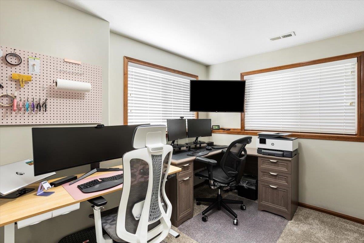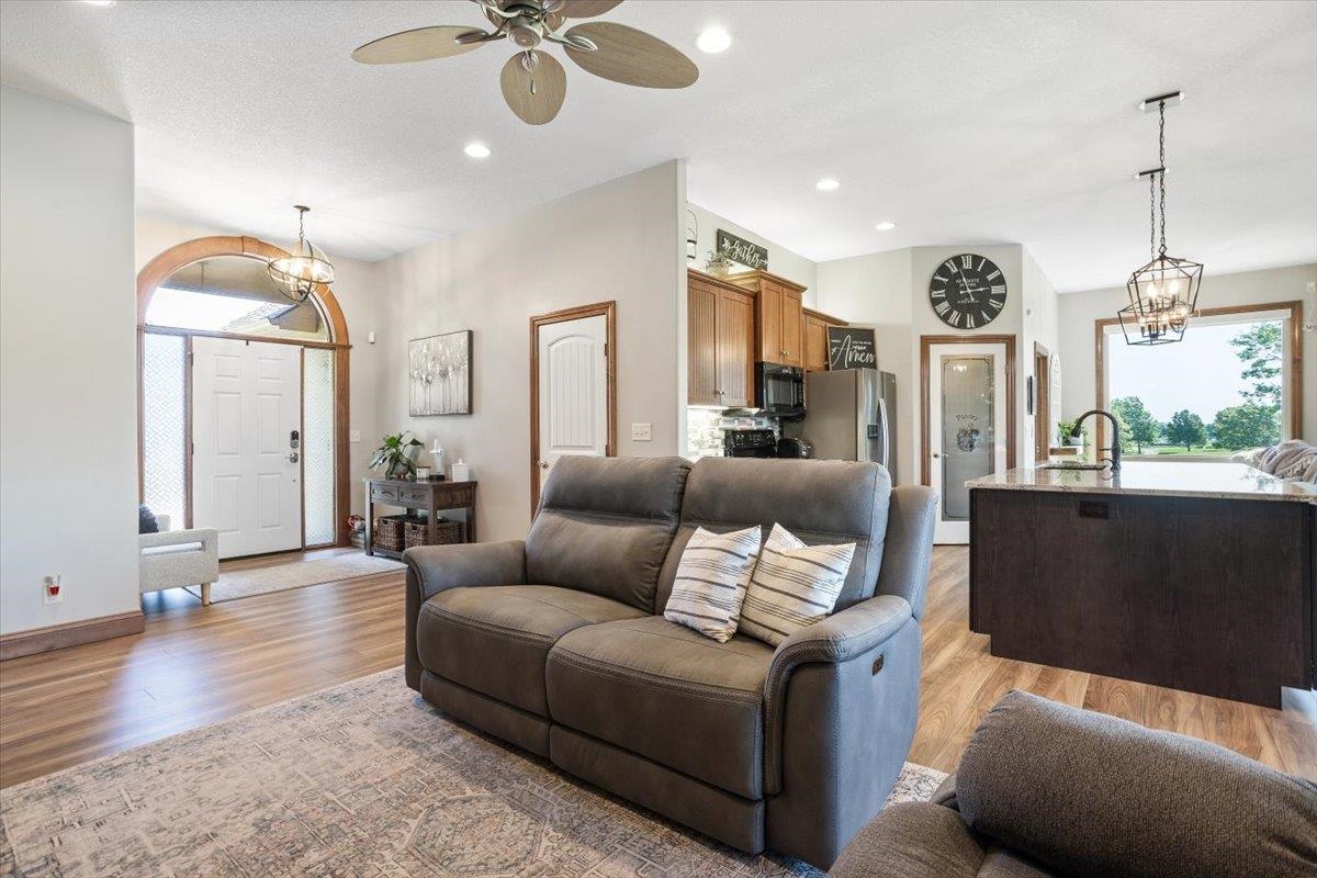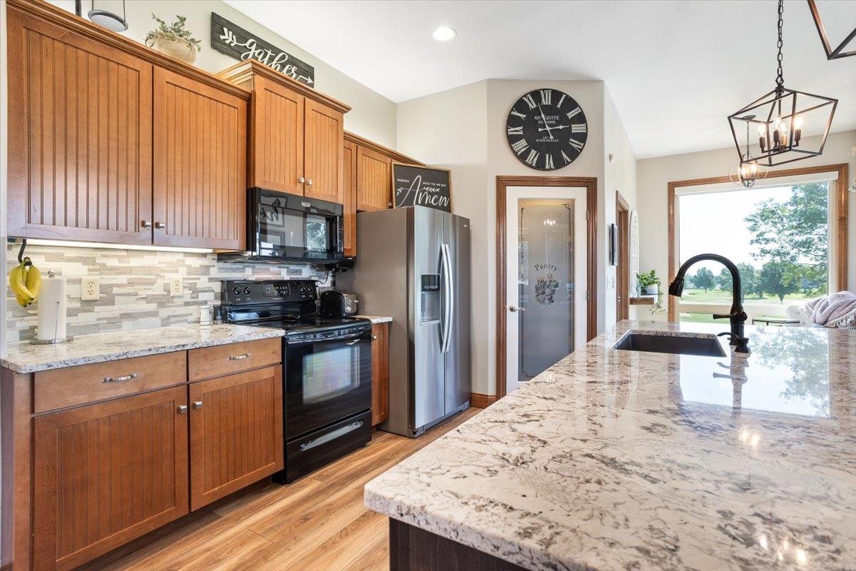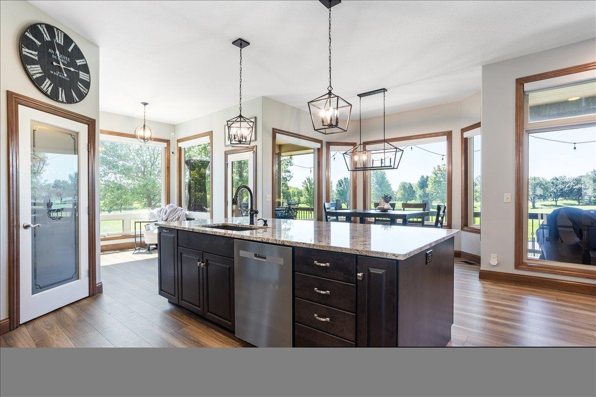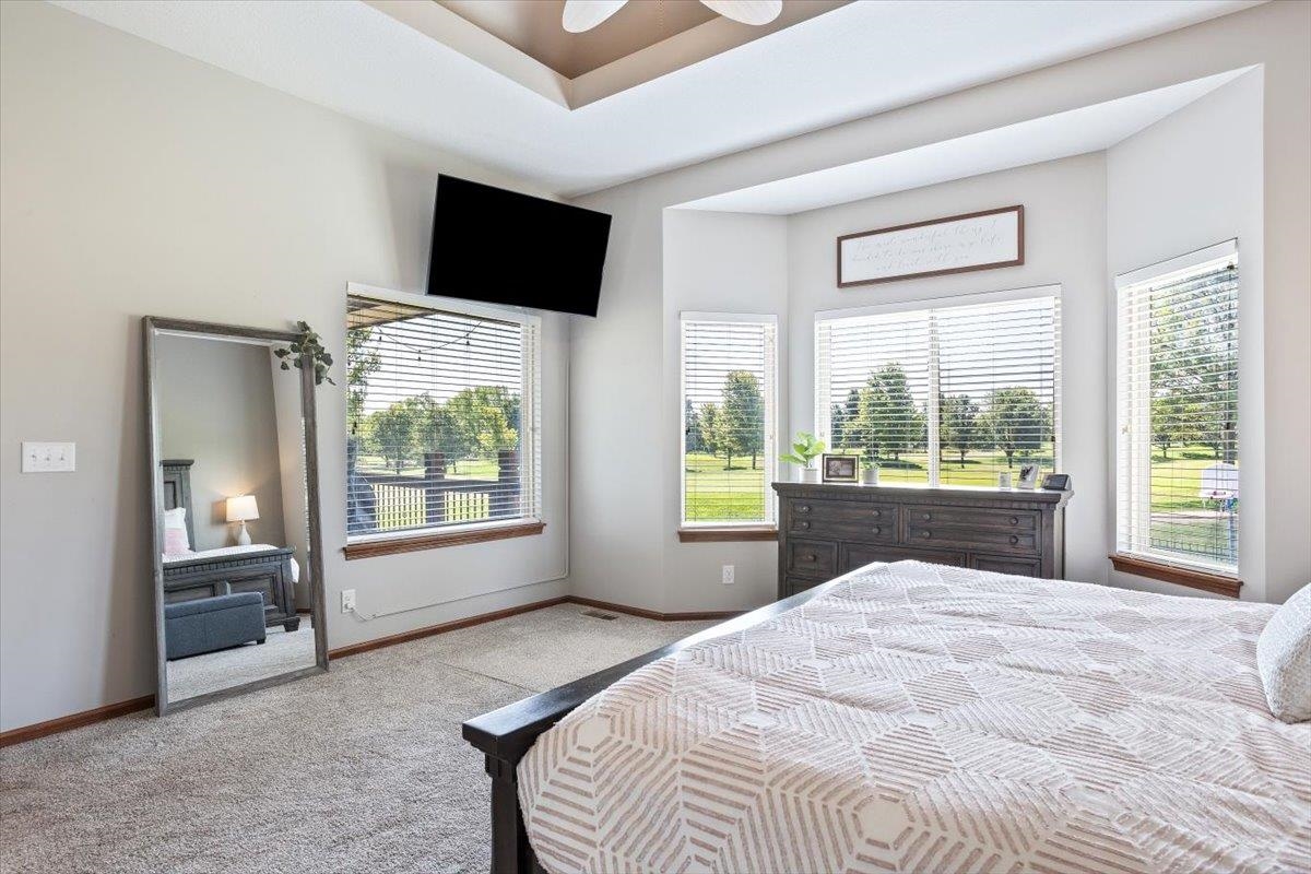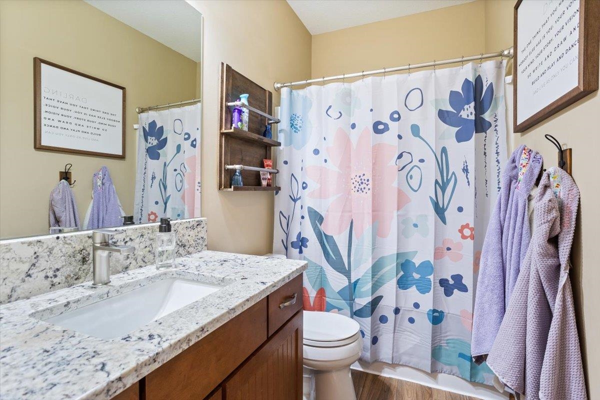 - Description: Nestled among mature trees on the Auburn Hills serene golf course, this stunning 5-bedroom, 3-bath, 3-car garage home boasts an extra side yard lot all enclosed by an iron fence. Inside, the house has been meticulously updated with luxury vinyl flooring throughout the entry, living room, kitchen, dining room, laundry room, and office nook. Large tinted windows span the back of the house, offering breathtaking views, while auto Rolli brand blackout blinds in the kitchen and living room provide privacy and comfort. The spacious kitchen features a new granite topped large island with ample storage on both front and back, a refrigerator, and a dishwasher, both less than a year old, along with a range and microwave. The living room is anchored by a cozy fireplace surrounded by built-ins, with a TV above that stays! The recently renovated laundry room includes extra storage and a granite folding area, with a stacked washer and dryer that are also less than a year old and stay with the home. The front-to-back split bedroom plan includes a large primary suite at the back of the house with his and hers closets and a newly redone full tile walk-in shower, granite vanity, and an additional make up vanity with linen storage. Bedrooms 2 and 3 offer just done custom closet organization with built-in drawers and shelving. A large deck runs across the back of the house, perfect for outdoor entertaining and enjoying the views. Concrete has recently been added around the entire home for enhanced convenience, seamlessly flowing into the expansive concrete patio at the back. The basement features a spacious family room with a wet bar and full-size fridge that stays, a play area under the stairs, two additional bedrooms, and a bathroom with a newly installed vessel bowl sink with granite. There is also a large store room in the basement. You’ll appreciate the convenience of easy access to the backyard through the walk out in the basement area. The home also includes a comprehensive security system with audio surveillance cameras inside and out, a nest thermostat, and a high-impact roof. Located in the desirable Auburn Hills subdivision in the Goddard school system, this home combines luxury, comfort, and security in a beautiful setting. Information deemed reliable but not guaranteed and may change without notice.