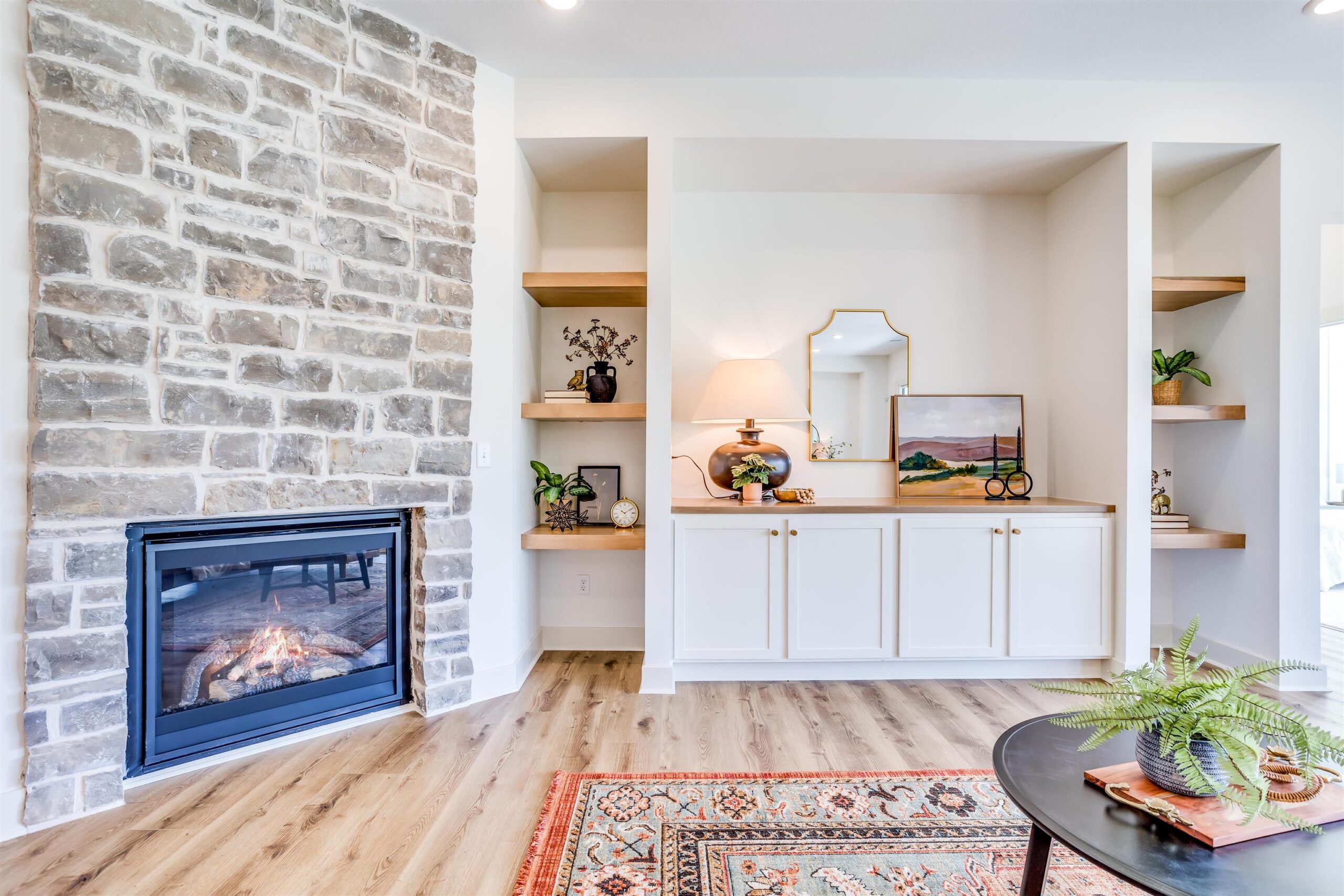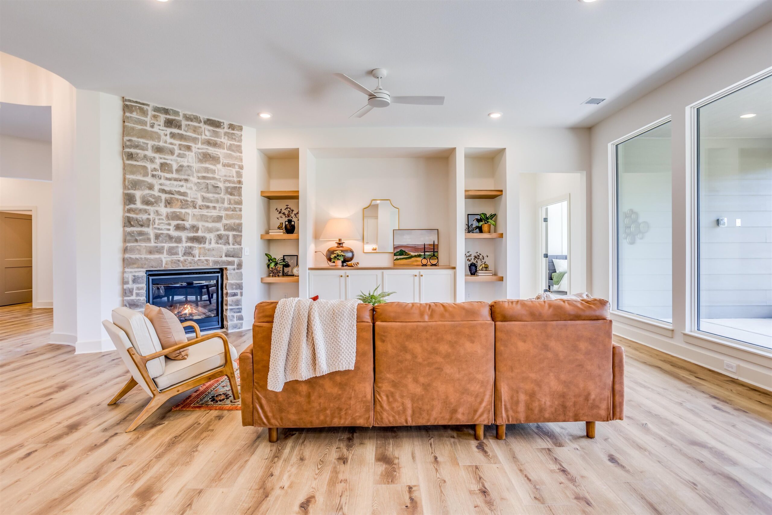 - Features: Ceiling Fan(s)DecorativeDecorative FireplaceFireplace Doors/ScreensGasGlass DoorsHumidifierLaminateLiving RoomOneSecurity SystemWalk-In Closet(s)