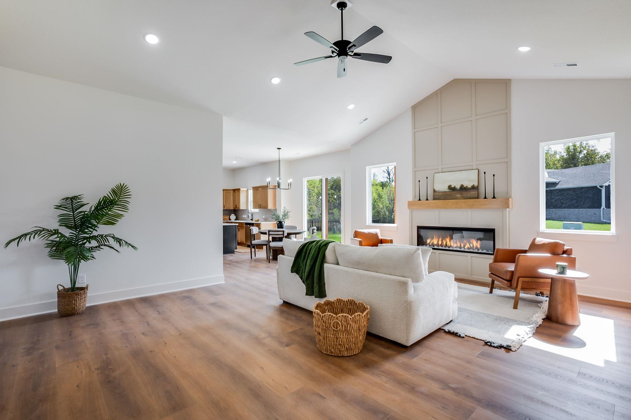 - Description: The Rowan floor plan is a great no step entry design located on a corner lot. this home offers 3 bedrooms, 2 baths, open great room/dining/kitchen area. There is also a decorative electric fireplace in the great room. The home has a U=shaped kitchen with center island, perfect for entertaining, large walk in pantry and covered patio. The Master suite includes double vanities, tiled shower and walk in closet. Perfect for the person that is tired of stairs with easy access to the entry, covered patio, garage etc. The price includes sprinkler system and landscaping.
