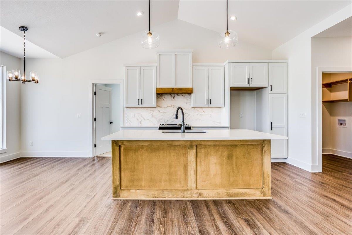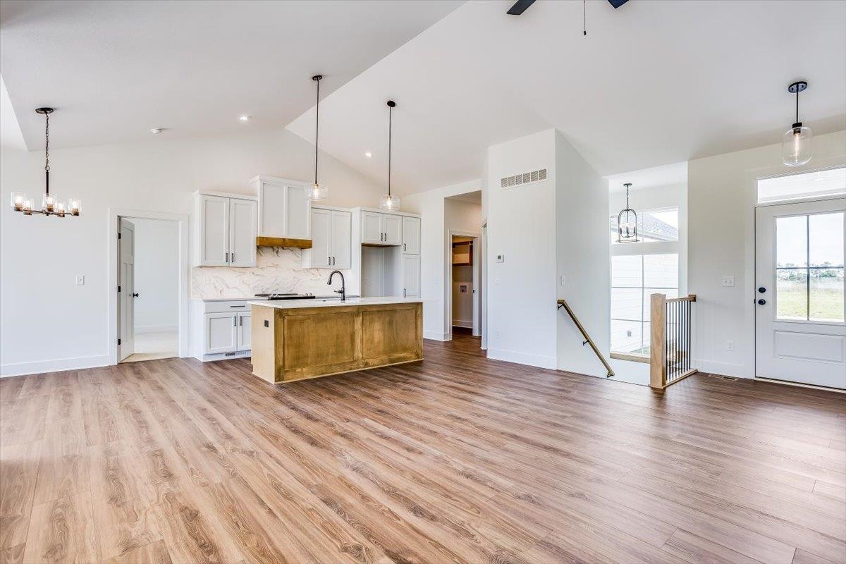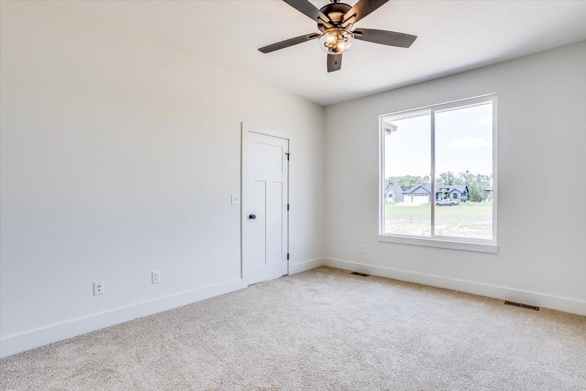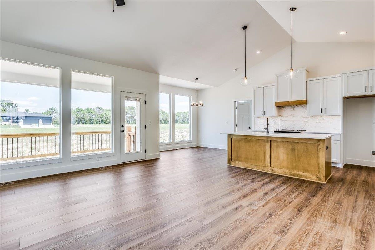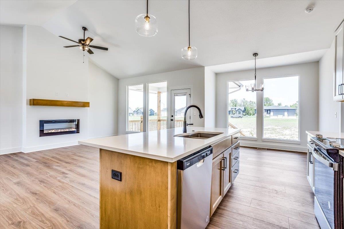- Description: Open Floorplan, great for entertaining! 5 bedroom, 3 bath 3 car garage with open kitchen, living dining combo nestled on a small cul-de-sac lot! Kitchen Island overlooks dining and living space with plenty of space to entertain. Kitchen features a walk-in pantry with plenty of storage and space to move around while cooking. Living room features access to covered deck overlooking back yard. Both kids rooms are on the other side of home. Master bedroom overlooks back yard with custom ceiling feature. Master bath has large shower with his and her vanities with nice size walk-in closet. Basement is finished with a 30 foot family room, 2 more bedrooms and a bathroom. Custom landscaping and sprinklers are included! Home is new construction and taxes have not been levied yet, you must call county to get accurate property tax info. All information deemed reliable, but not guaranteed.