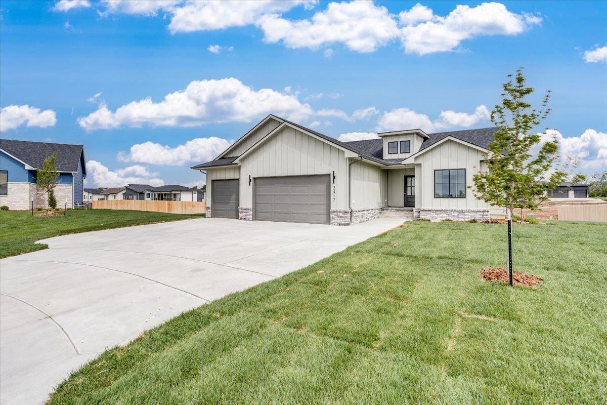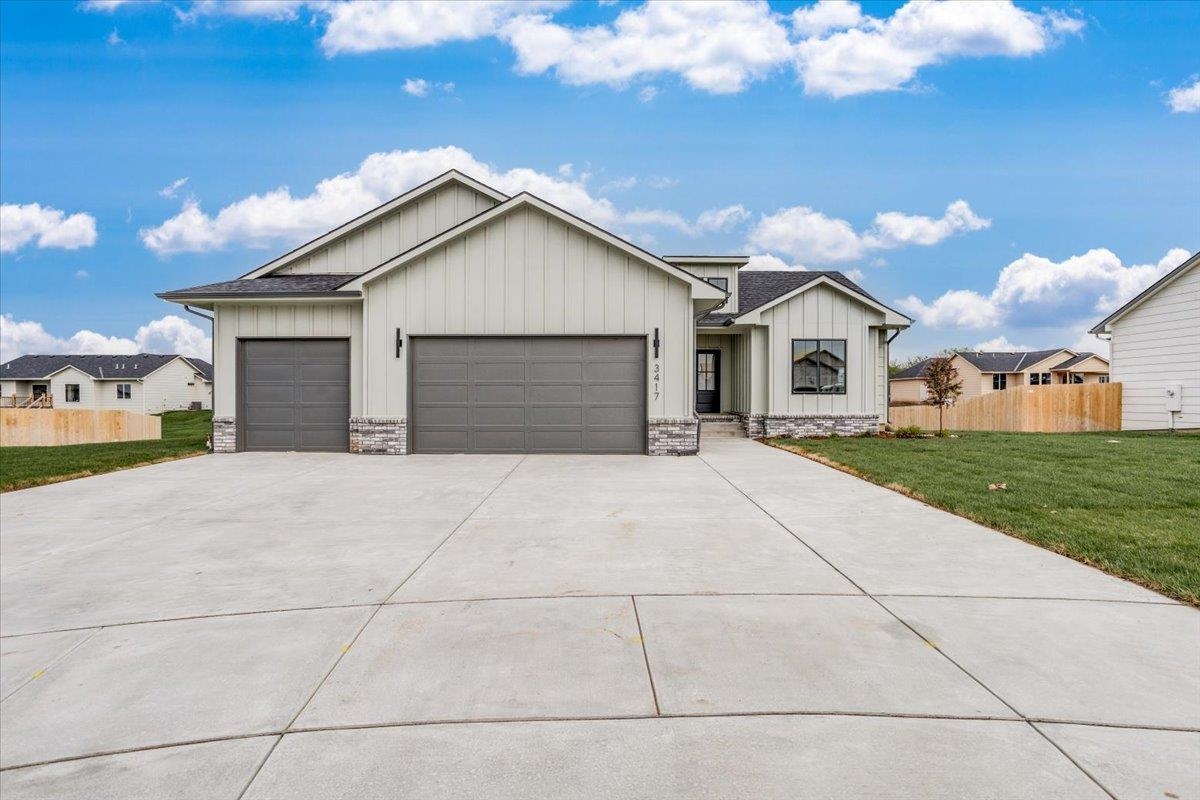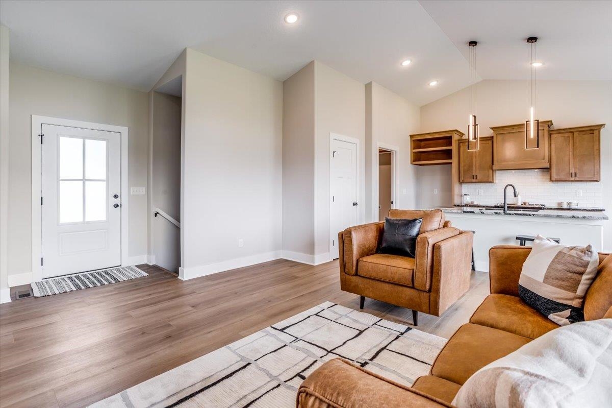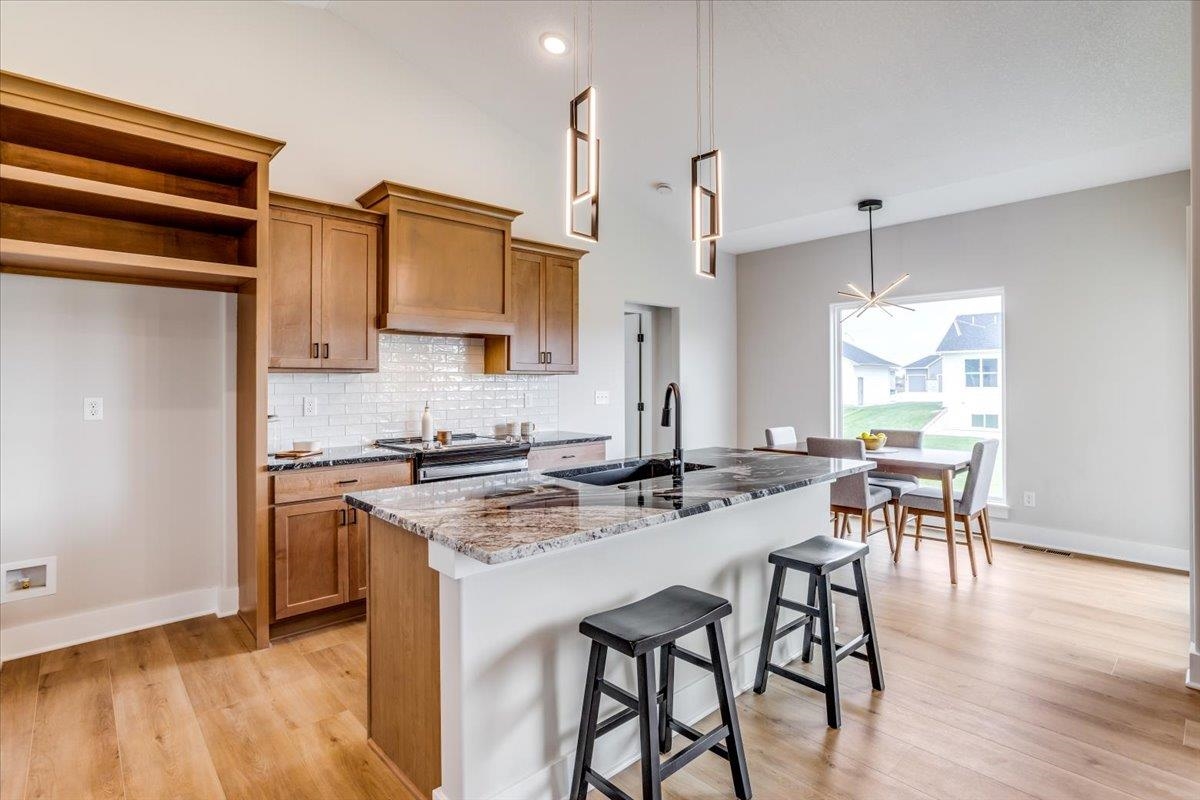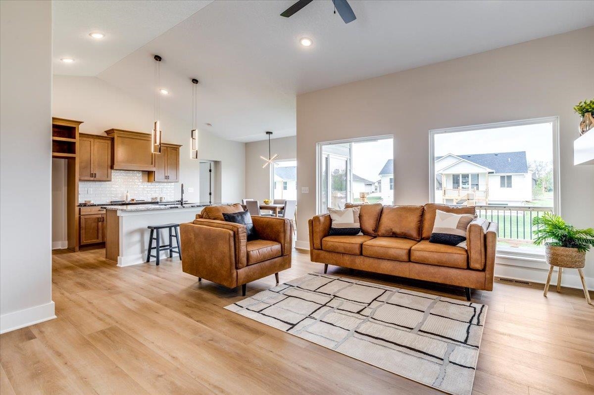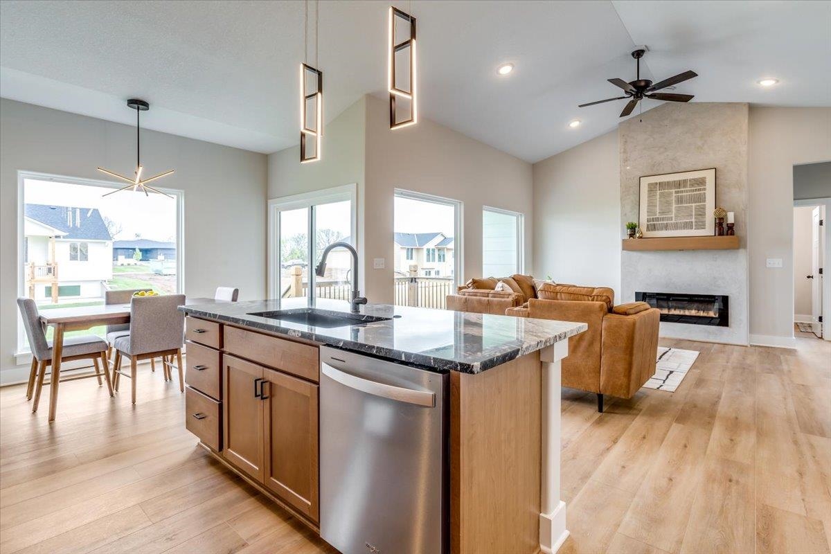 - Description: Open Floorplan, great for entertaining! 3 bedroom, 2 bath 3 car garage with open kitchen, living dining combo nestled on a small cul-de-sac lot! Kitchen Island overlooks dining and Vaulted living space with plenty of space to entertain. Kitchen features a pantry with plenty of storage and space to move around while cooking. Living room features access to covered deck overlooking back yard. This is a split bedroom plan. Master bedroom overlooks back yard with custom ceiling feature. Master bath has large 5 ft shower with his and her vanities with nice size walk-in closet. Basement finish includes two additional bedrooms, family room, full bathroom and wet bar. Sod, sprinklers and landscaping is included! Home is new construction and taxes have been estimated. All information deemed reliable, but not guaranteed and may be changed without prior notice.