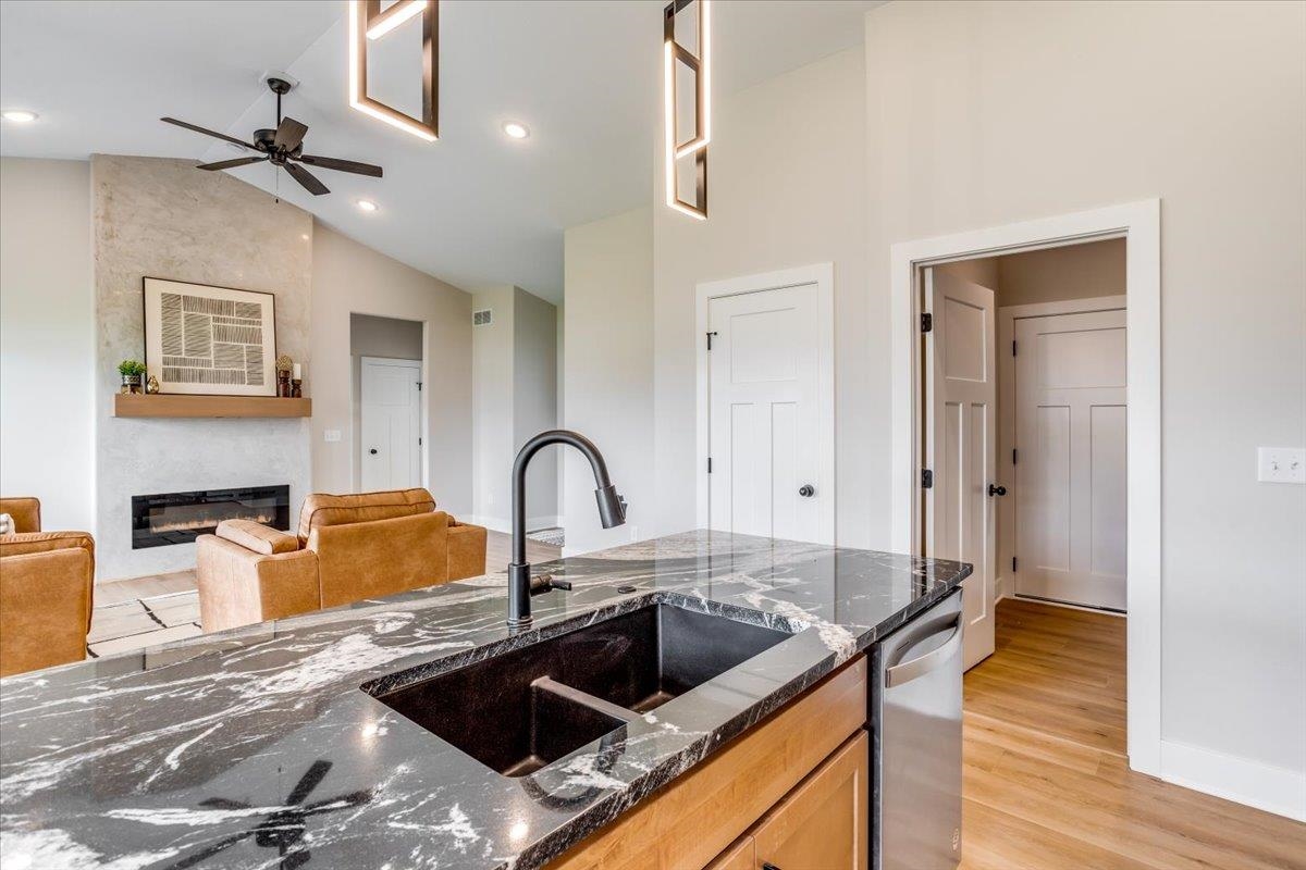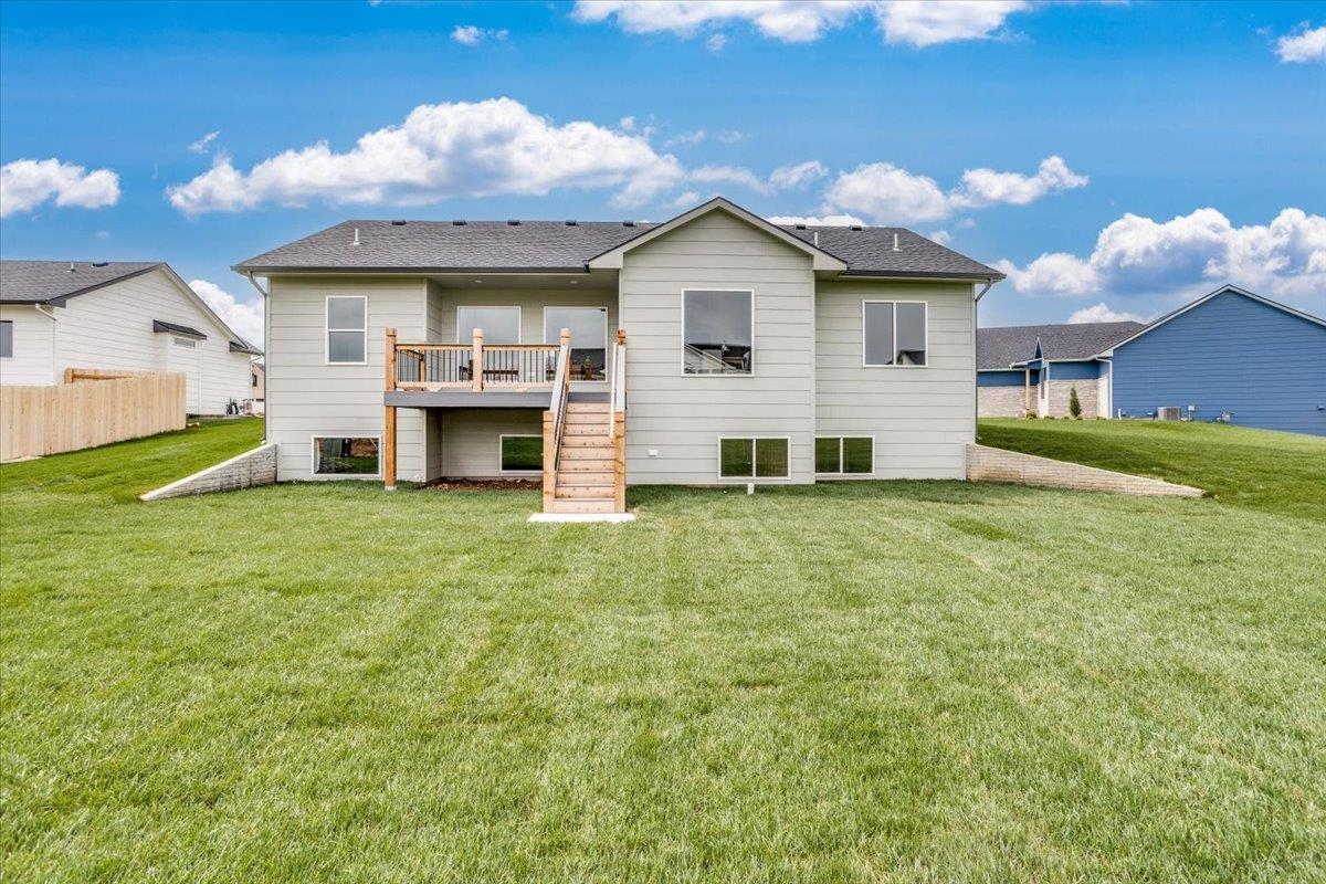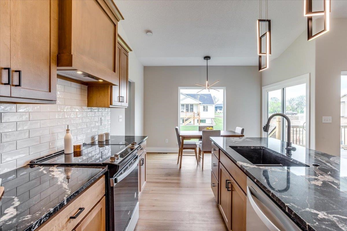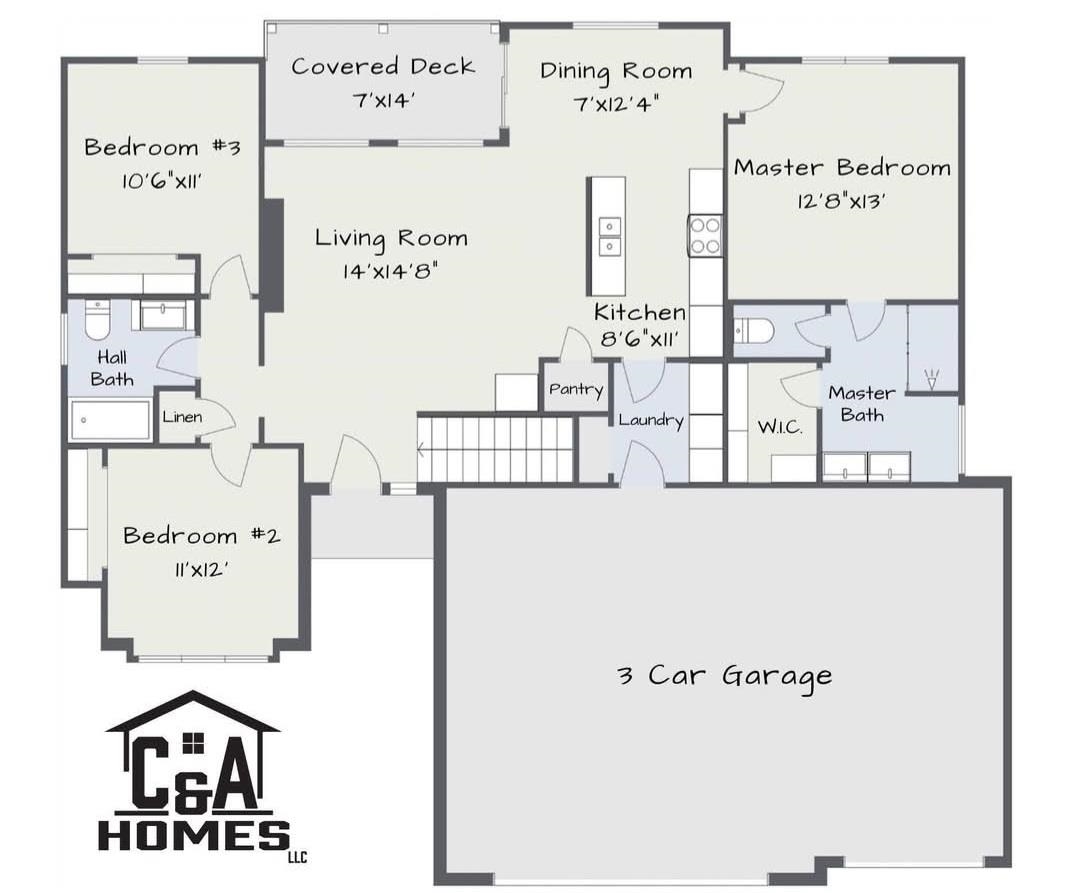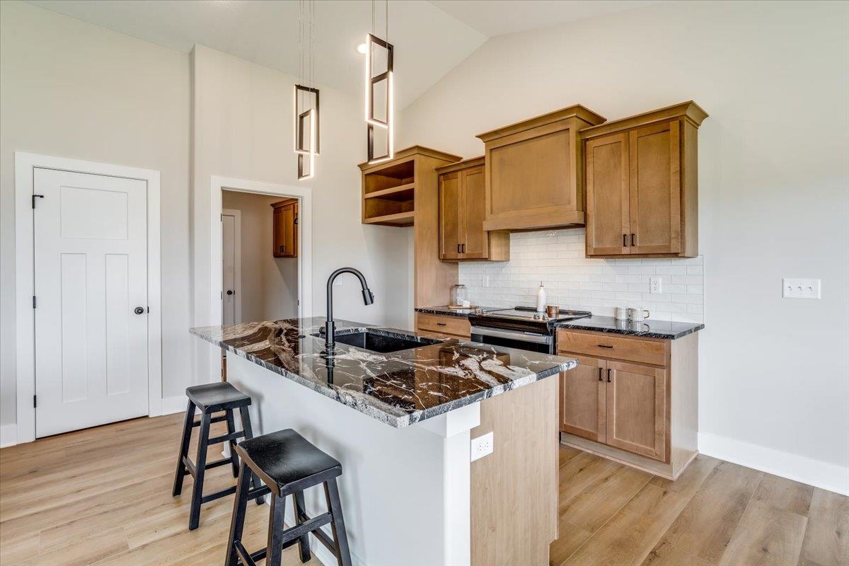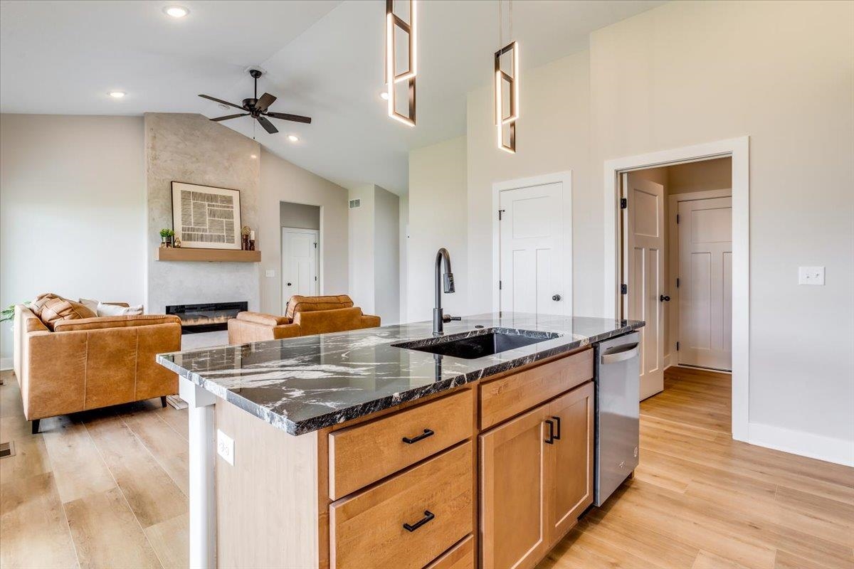 - Description: Open Floorplan, great for entertaining! 3 bedroom, 2 bath 3 car garage with open kitchen, living dining combo nestled on a small cul-de-sac lot! Kitchen Island overlooks dining and Vaulted living space with plenty of space to entertain. Kitchen features a pantry with plenty of storage and space to move around while cooking. Living room features access to covered deck overlooking back yard. This is a split bedroom plan. Master bedroom overlooks back yard with custom ceiling feature. Master bath has large 5 ft shower with his and her vanities with nice size walk-in closet. Basement finish includes two additional bedrooms, family room, full bathroom and wet bar. Sod, sprinklers and landscaping is included! Home is new construction and taxes have been estimated. All information deemed reliable, but not guaranteed and may be changed without prior notice.