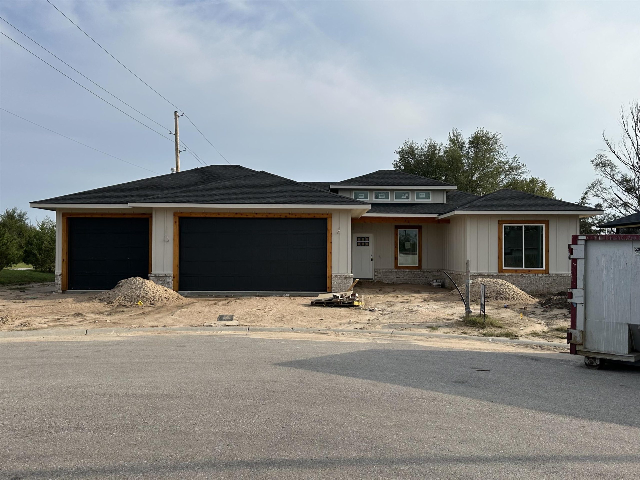 - Description: The "Piccolo" plan made larger with 3 bedrooms, 2 baths, and 3 car garage! Lovely kitchen in the very open plan with a nice island with seating overlooking the living room with electric fireplace. You'll love the pretty stone on surrounding the fireplace! Primary suite is spacious with an extra large closet. Off to the side you’ll enjoy the covered back patio. Spacious 3 car garage includes storm shelter. Curbless shower in primary bath. Fence is included in addition to an extra large concrete patio out back! Includes well, sprinkler, sod, and landscaping. In Edgewater Patios, the homeowners have control over their own well and sprinkler systems, so you determine when and how much you water. Information deemed reliable but not guaranteed and may change without notice. Room sizes estimated. Taxes estimated and shown on vacant lot. Specials may not be entirely spread yet on this lot. There is a $250 mailbox fee collected at closing. One member of Wells Construction LLC is licensed realtor in state of Kansas.