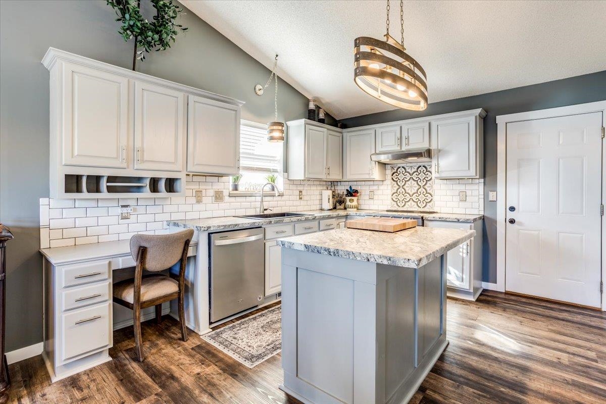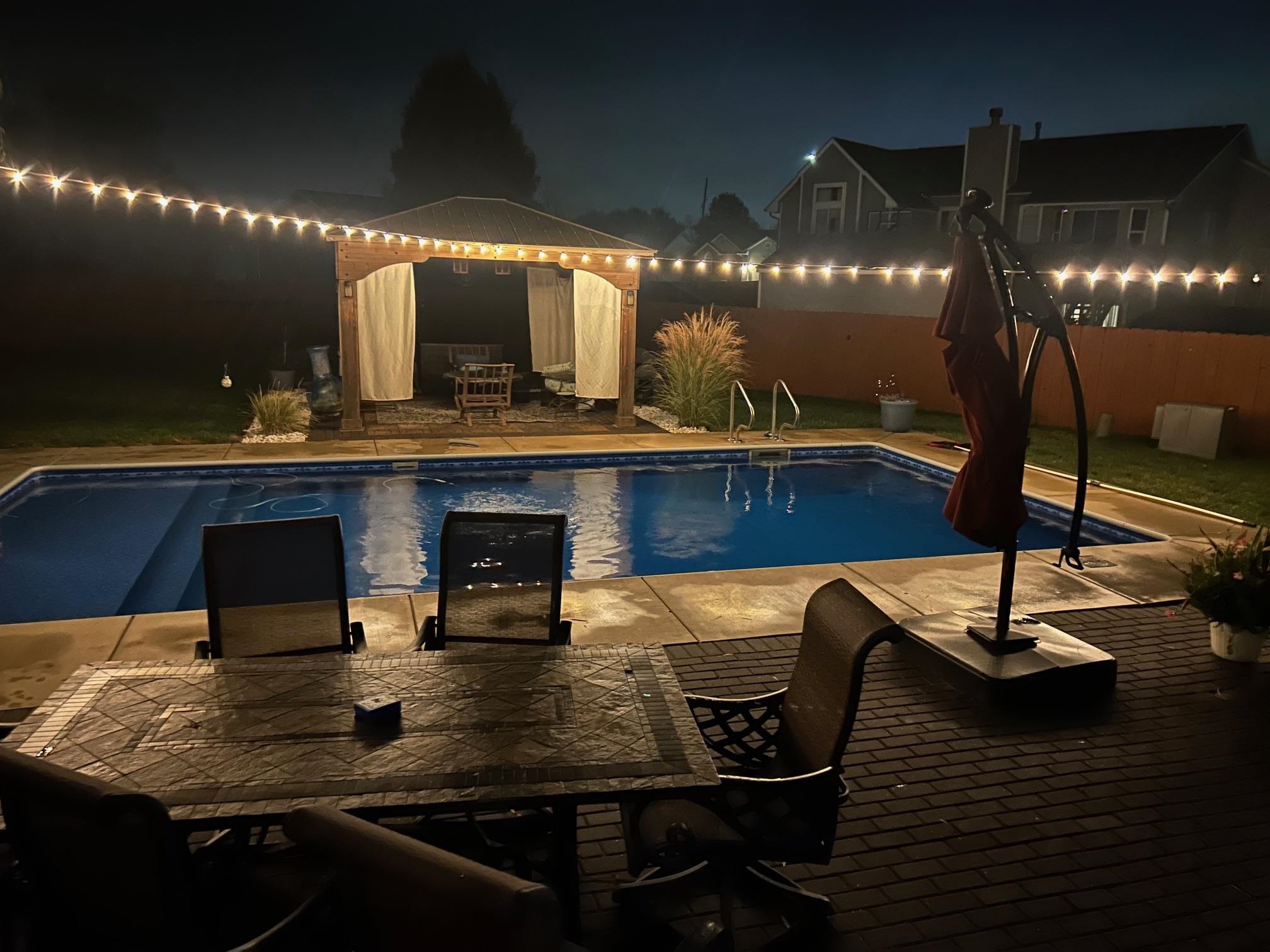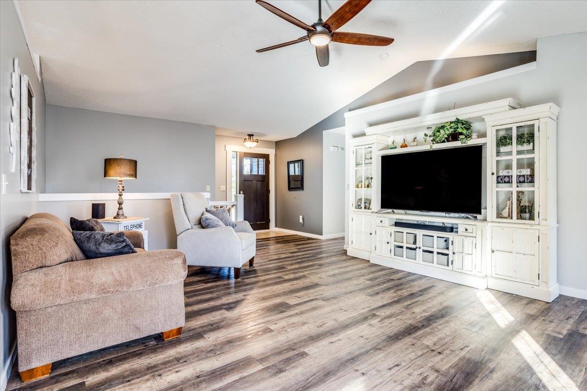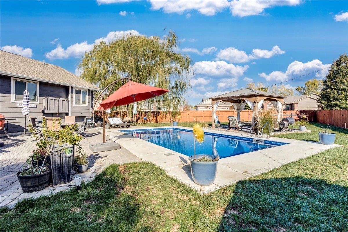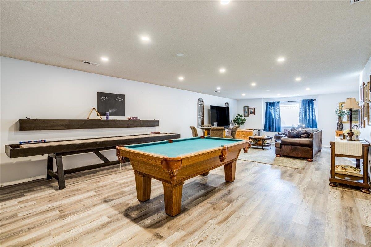 - Description: A perfect home fo anyone that enjoys entertaining and family. This split 3 bedroom (on the main floor), 3 bath, ranch style home with a 3 car garage is an open design with U-shaped kitchen, ample cabinets, smart range, with decorative tile backsplash, large island, open to dining, great room with gas fireplace, open rec room/game room, and the additional 2 bedrooms giving a total of 5 bedrooms. The home has been updated with new features throughout the home. The back yard is like a dream featuring a large deck, inground 16 x 32 2 year old pool with a 5' sun bathing feature, large tv attached, large coveed gazeebo, storage shed as well as a privacy fence located on a large corner cul de sac lot. The seller is willing to leave the pool table and shuffleboard table with the home.