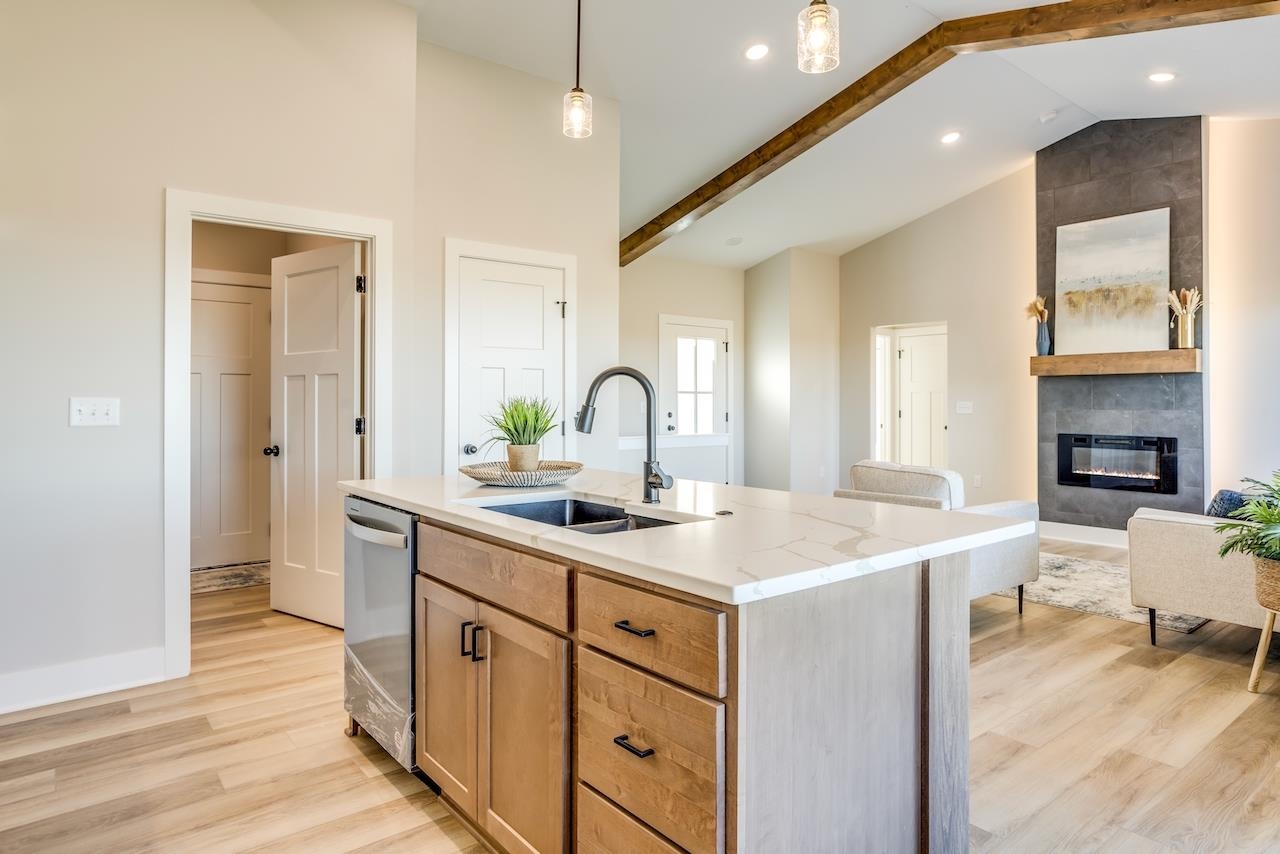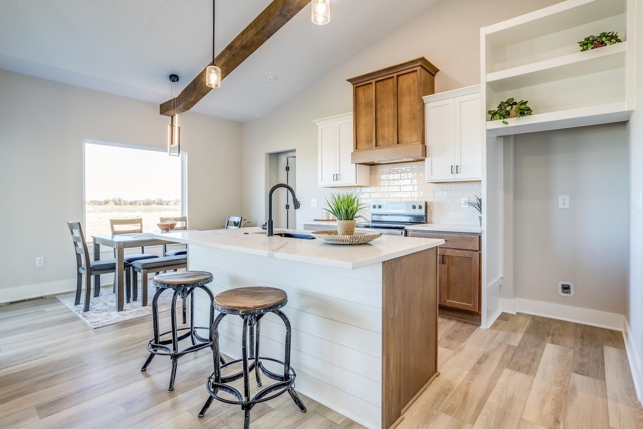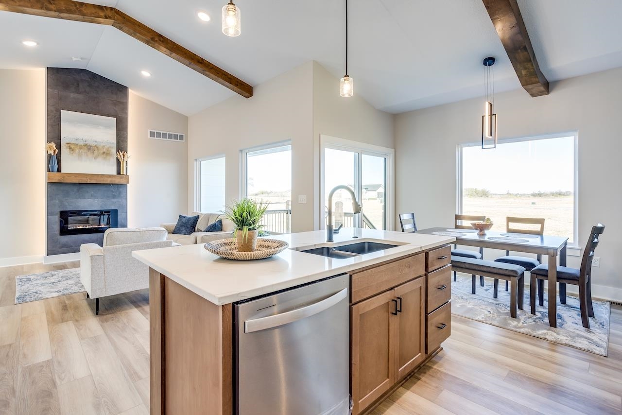 - Description: Bigger is definitely better with this brand new, expanded version of C&A Homes’ most popular plan…the Bunker Plan! Located in the City of Wichita and the Valley Center School District. The main floor features a spacious living room with vaulted, beamed ceilings and electric fireplace, a well-appointed kitchen with quartz countertops, and a generously sized dining room with access to the fully covered deck. The Master Suite is equipped with a private bath complete with a tile walled shower, dual vanity with quartz countertops, and a walk-in closet. The main floor also features 2 additional bedrooms accompanied by a hall bath complete with quartz countertops. The unfinished lower level has been framed and roughed-in to include an expansive family room, 2 additional bedrooms, a hall bath, and plenty of storage. With the unfinished basement already being framed and roughed in, it offers a great opportunity to grow into your new home while building some significant sweat equity, or it can be finished by the Builder upon request! Start enjoying life today in beautiful Watermarke! So close to shopping and dining options, near all the major highways, and so convenient to the highly sought after Valley Center Schools! Please note that the finished interior pictures are of a home previously built in Watermarke and exact finishes will vary. Some information may be estimated…information deemed reliable but not guaranteed. Please verify schools with USD 262.