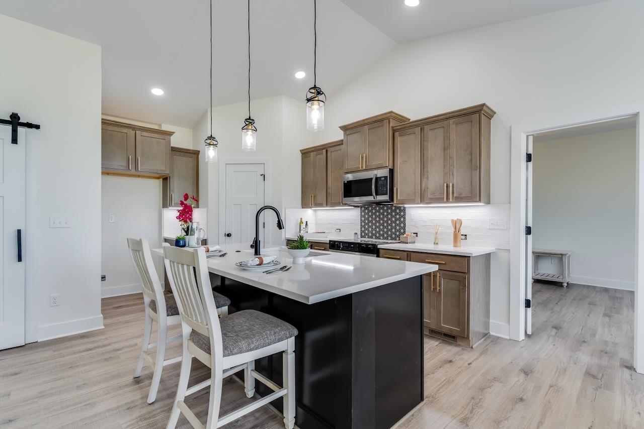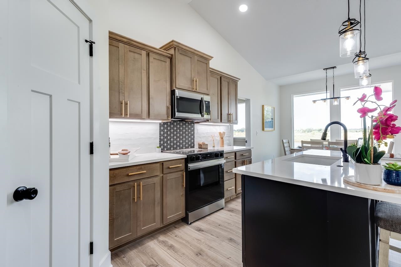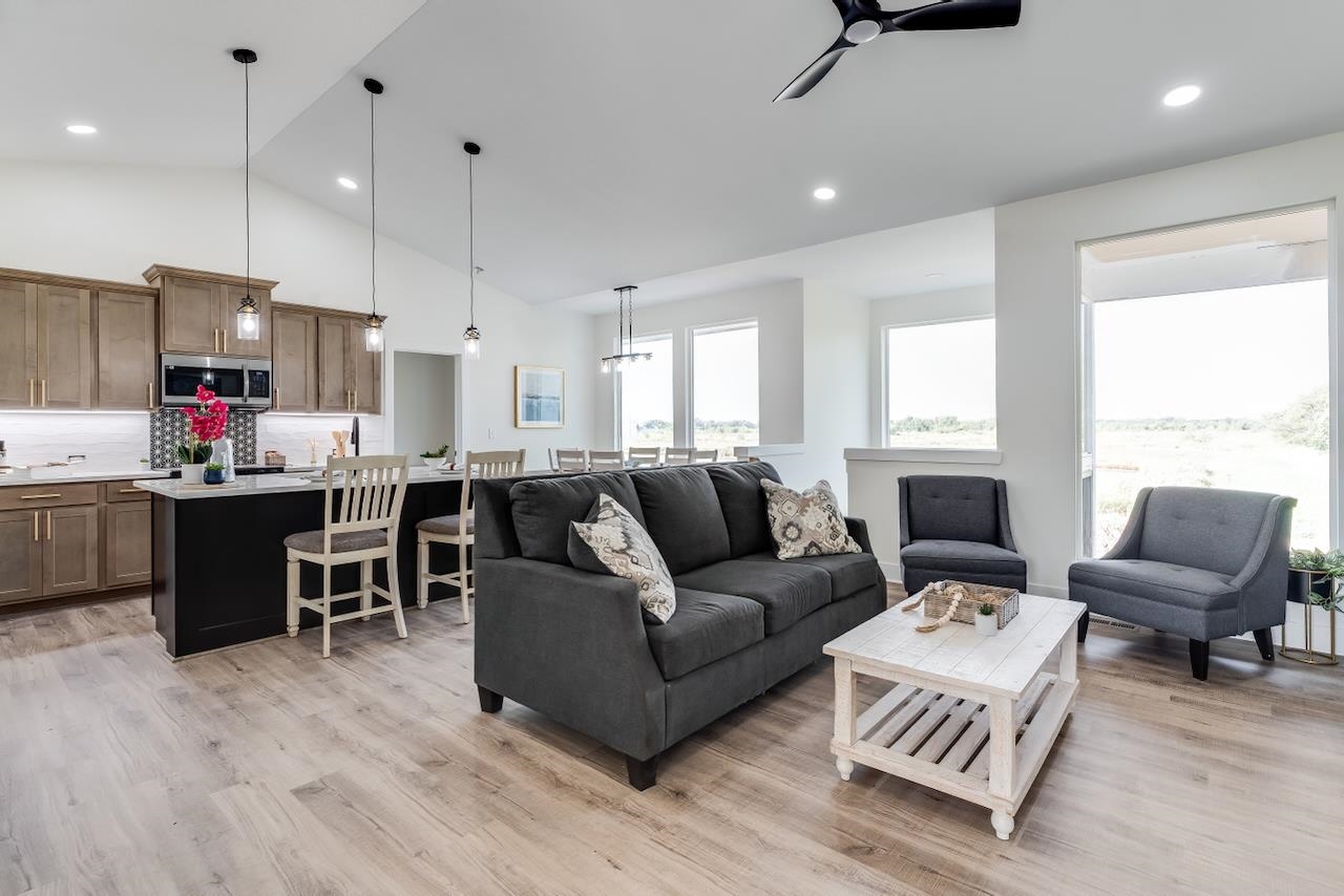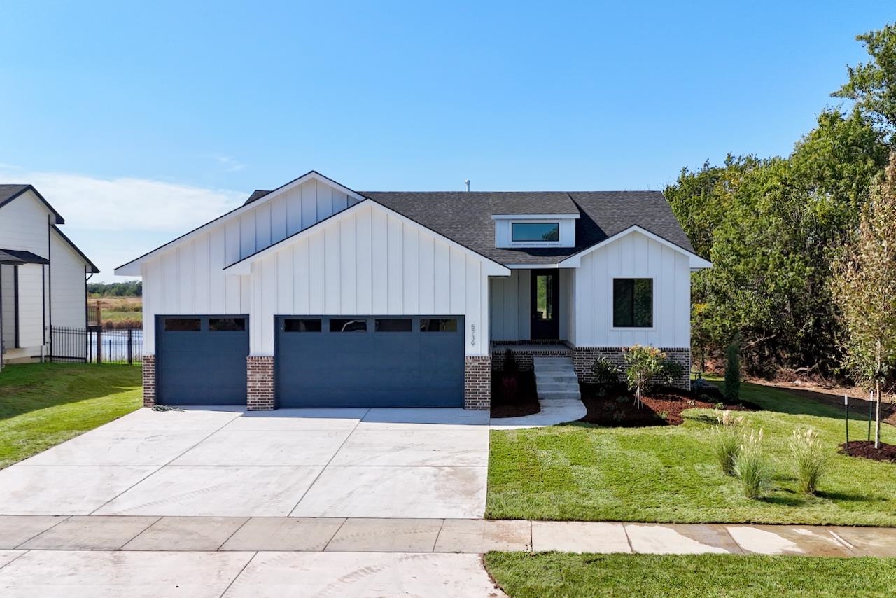 - Description: Discover the Anne Marie Plan by Homes-R-Us—where timeless architecture meets modern comfort in a truly one-of-a-kind lakefront setting. Nestled on a unique lot bordered by HOA green space and a natural land bridge between two serene lakes, this home is surrounded by mature trees offering privacy and picturesque views. Enjoy vaulted ceilings, LVP flooring, and a cozy electric fireplace in the spacious living room. The gourmet kitchen boasts quartz countertops, abundant cabinetry, and a walk-in pantry. A generous dining area showcases large picture windows framing lake and wooded views. The luxurious primary suite features a dual vanity, tile shower, and walk-in closet with seasonal hanging. Two additional bedrooms and a full hall bath complete the main floor. The mid-level walk-out leads to a sprawling covered patio—your private retreat among the trees. The basement is ready for your vision, with a proposed layout including a family room, wet bar, 2 bedrooms, and full bath. Choose to finish it with the builder or create instant equity over time. Just a short stroll to the neighborhood pool, playground, and basketball court—this home has it all! Some information may be estimated and is not guaranteed. Please verify schools with USD 262.